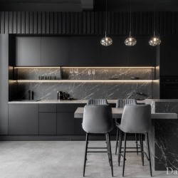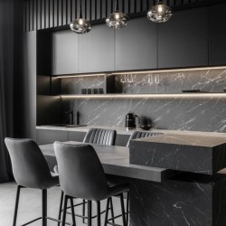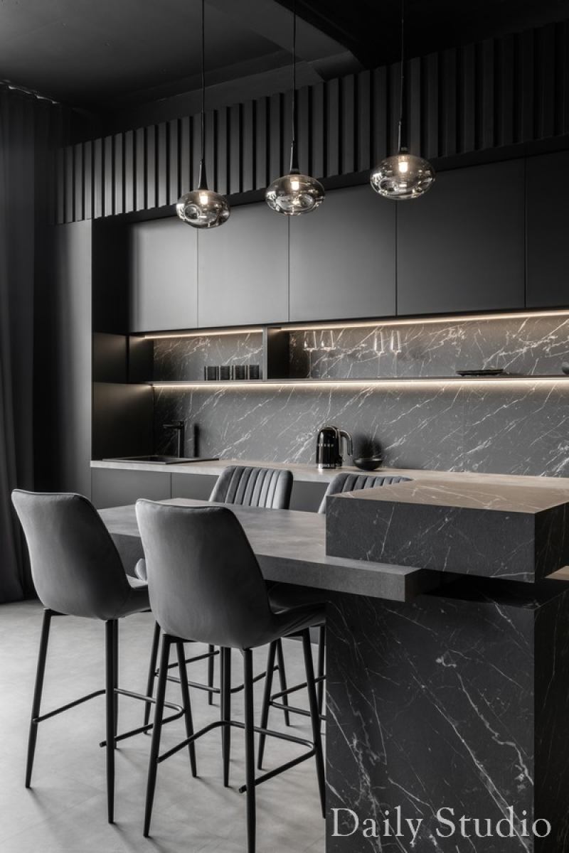 — просторная кухня в темных тонах с мраморным фартуком и столешницей, глянцевыми фасадами и встроенной техникой (ВНИМАНИЕ! Кухня нерабочая);