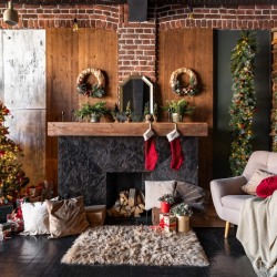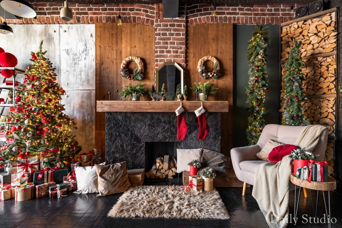 — камин с рождественскими композициями, креслом в стиле ретро и уютными пледами с подушками;