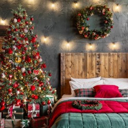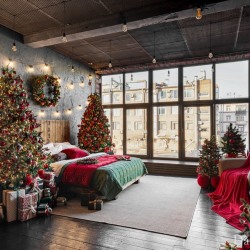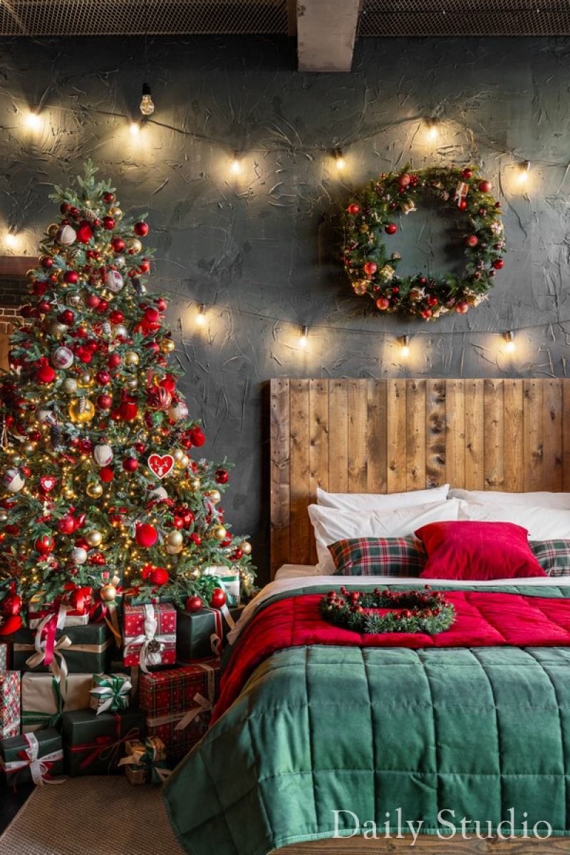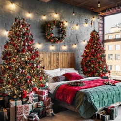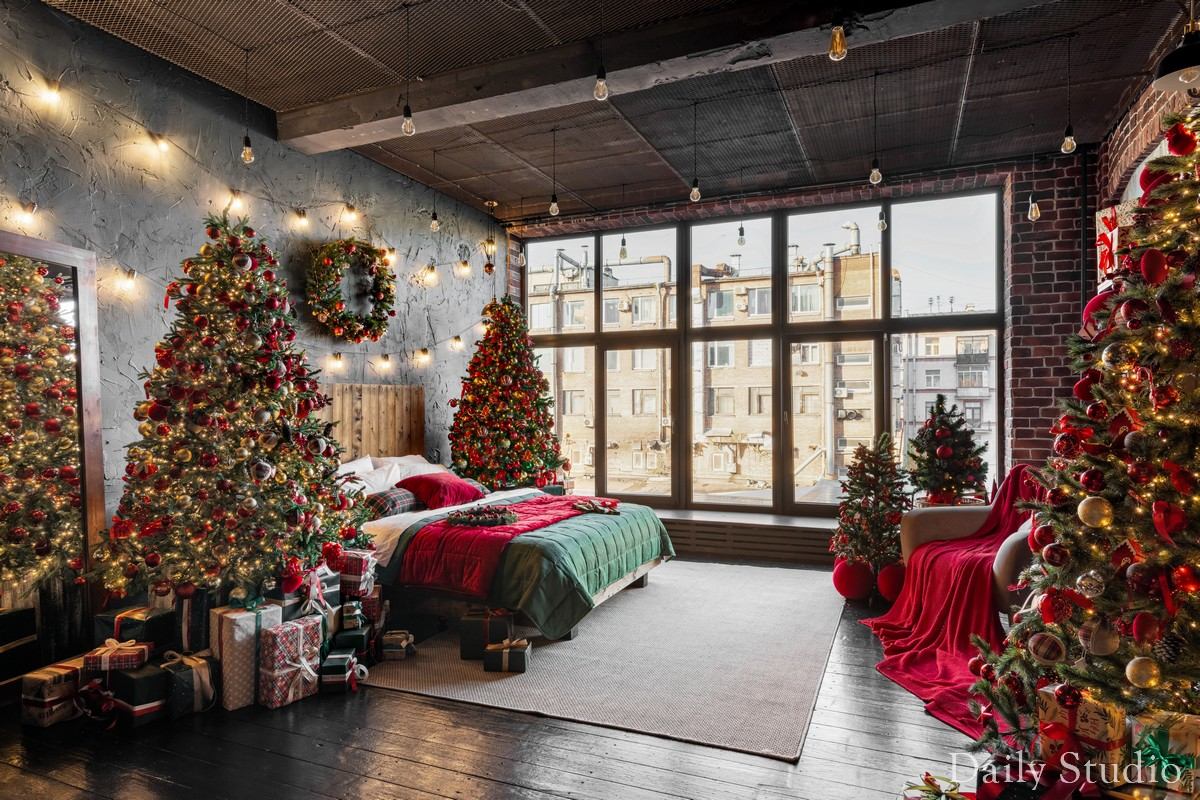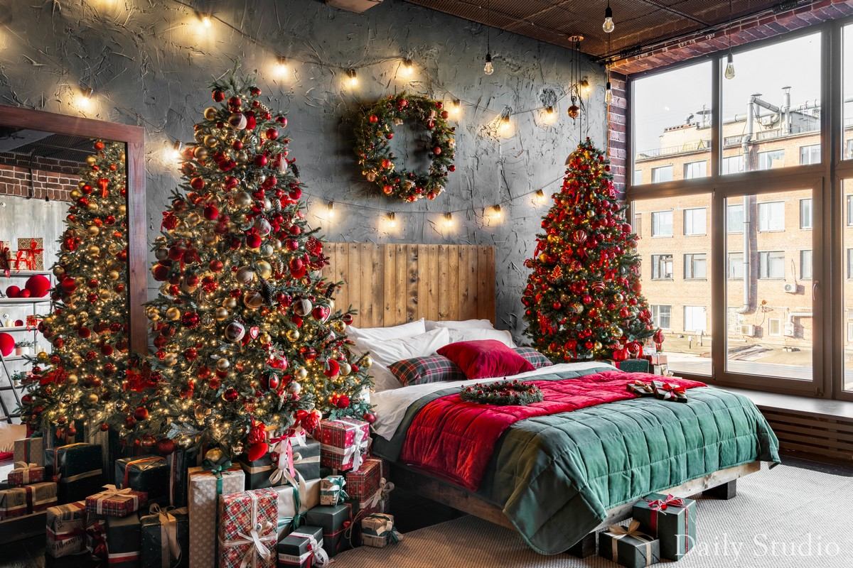 — большая кровать из дерева с пышными елками и подарочными коробками;