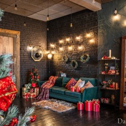 — изумрудного цвета диван с подушками и пледом на фоне кирпичной стены и гирлянд;