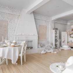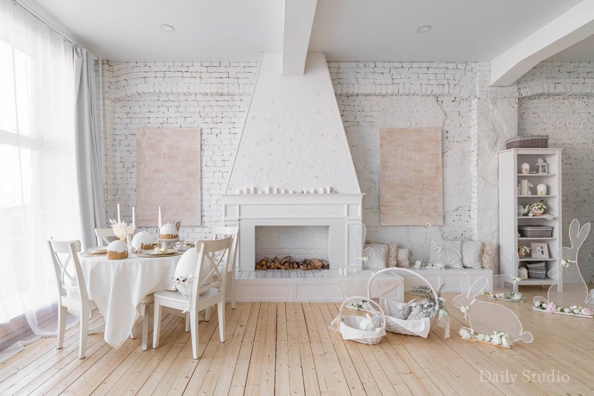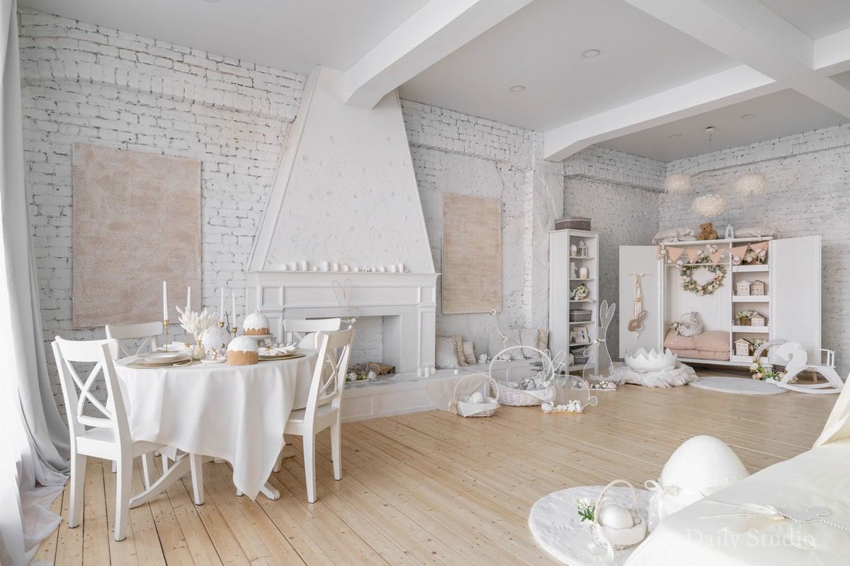 — зона с белым камином, обеденным круглым столом и пасхальными декорациями;