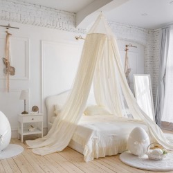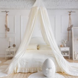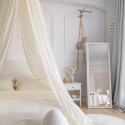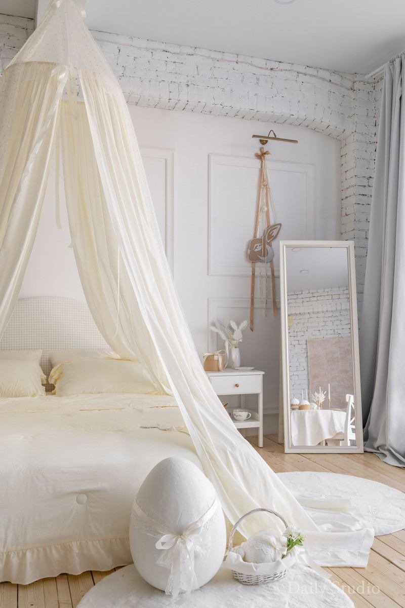 — светлых тонов кровать с балдахином, прикроватными тумбами и напольным зеркалом;