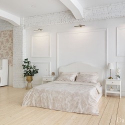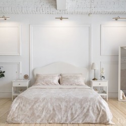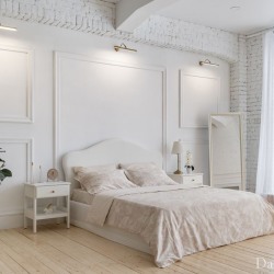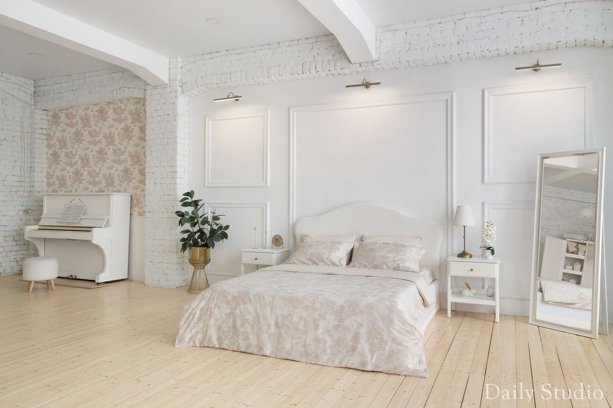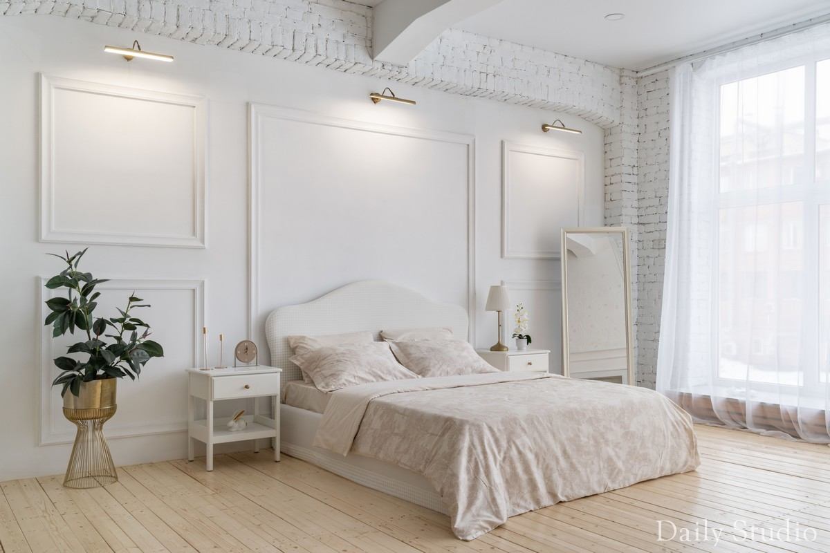 — зона с большой кроватью, прикроватными тумбами и напольным зеркалом;