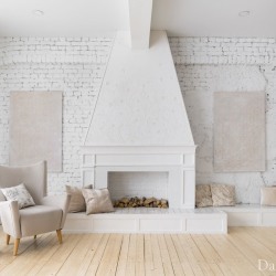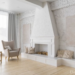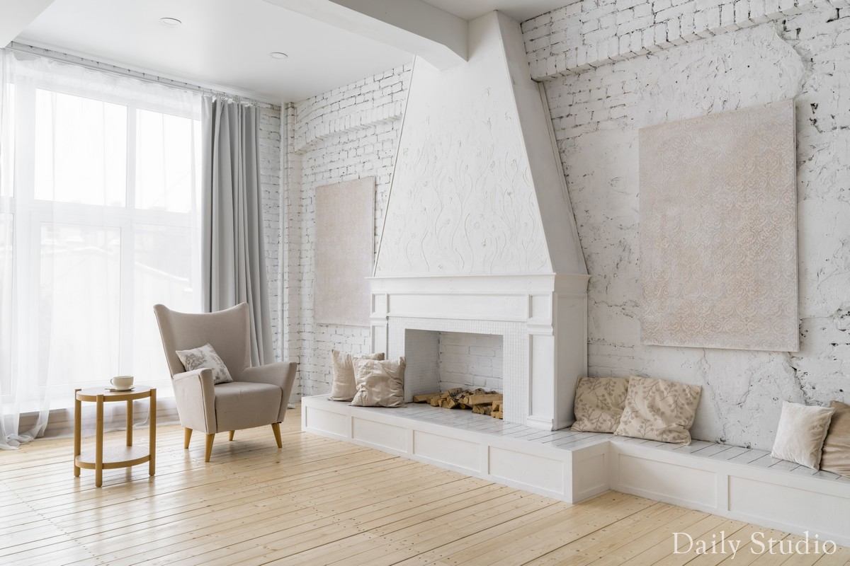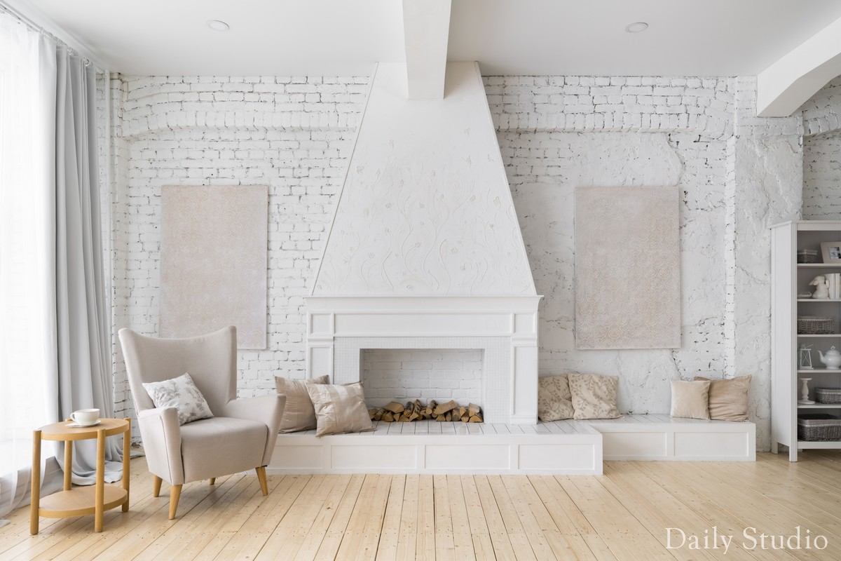 — зона с белым камином, бежевым креслом и журнальным столиком;