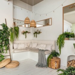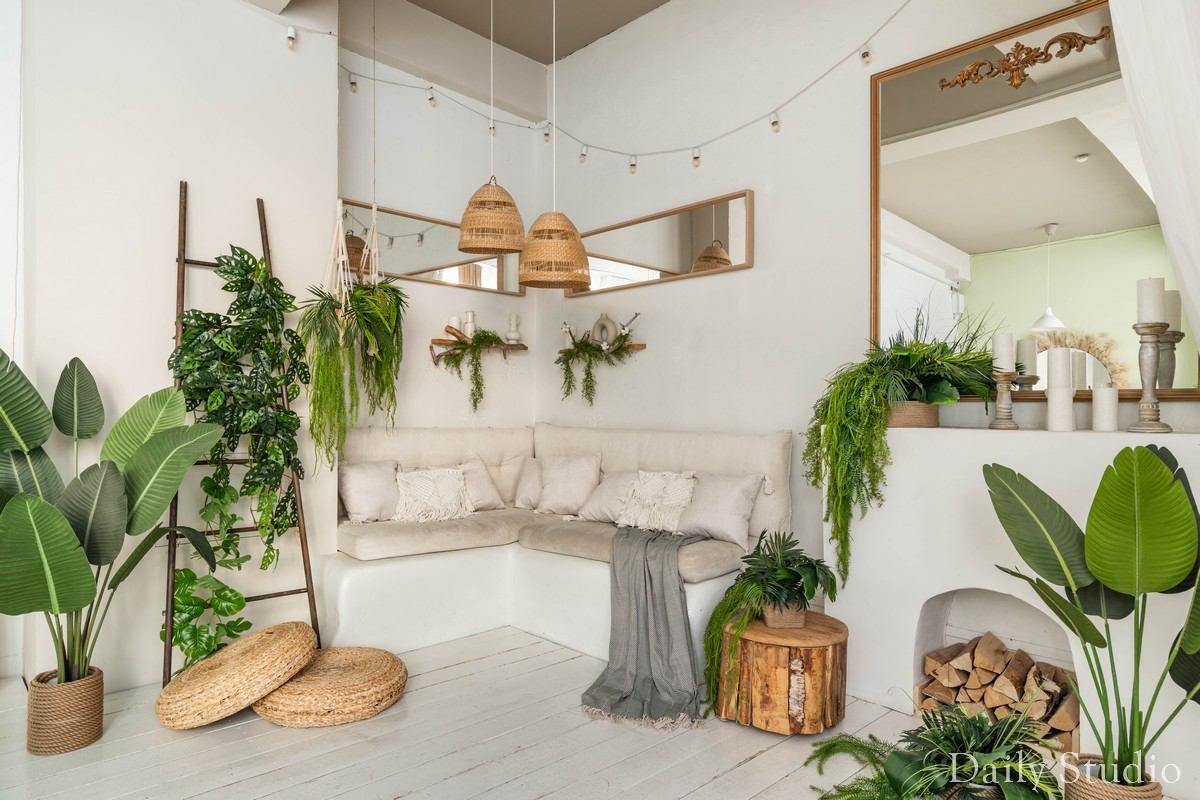 В зале преобладают балийские мотивы, светлые отделочные материалы и свобода от границ пространства. Зал умело разделен на 2 зоны, создавая возможность для многообразия творческих идей. Мебель сделана из естественных материалов, а обилие живых растений наполняет пространство свежестью и натуральной гармонией.