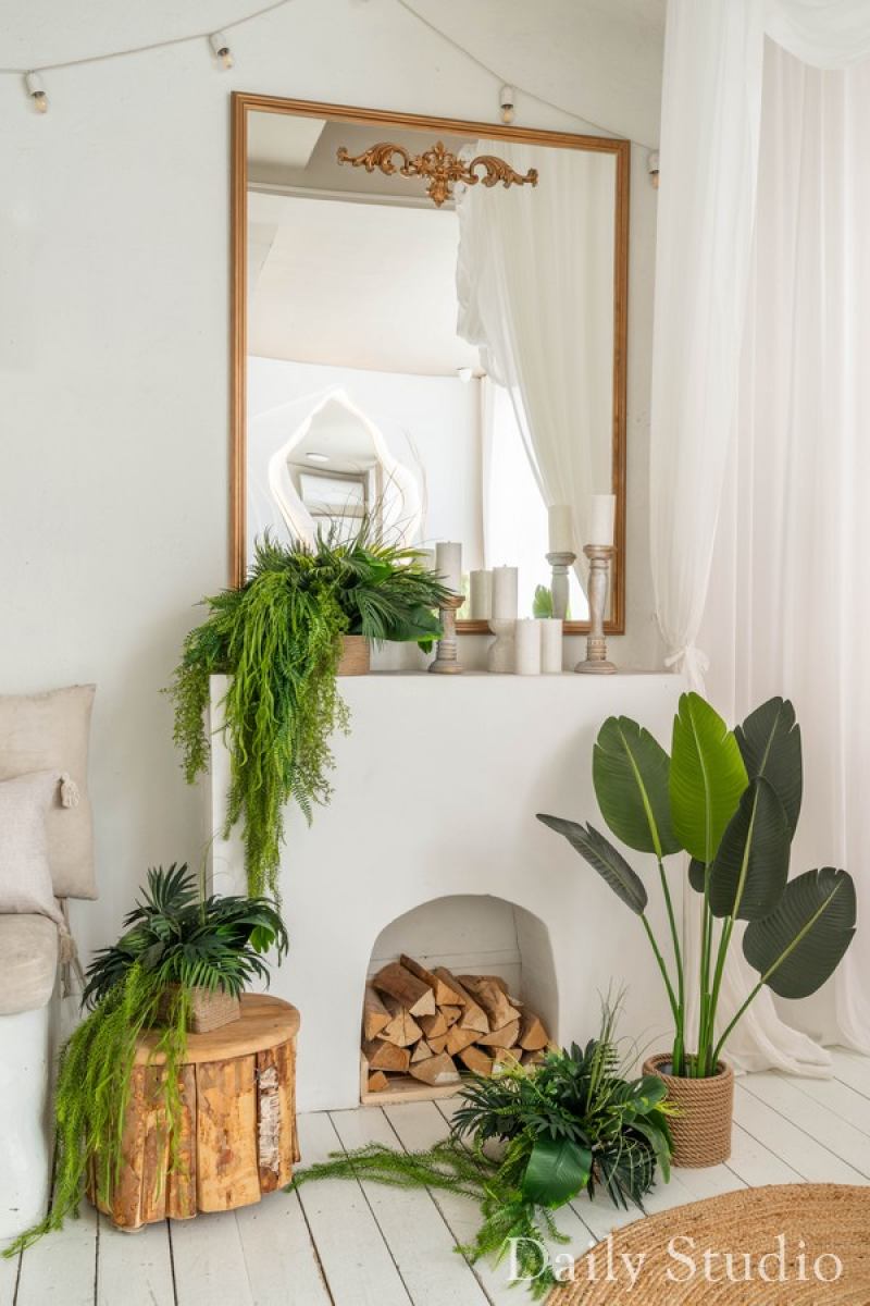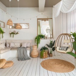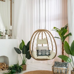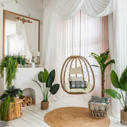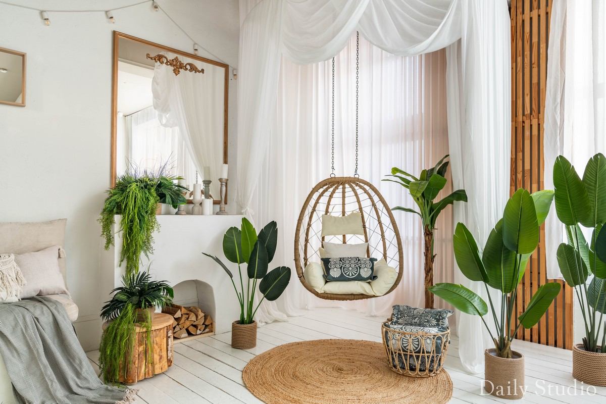 — Зона с подвесным креслом из дерева на фоне белых тканей;