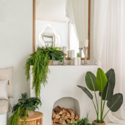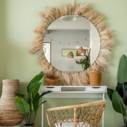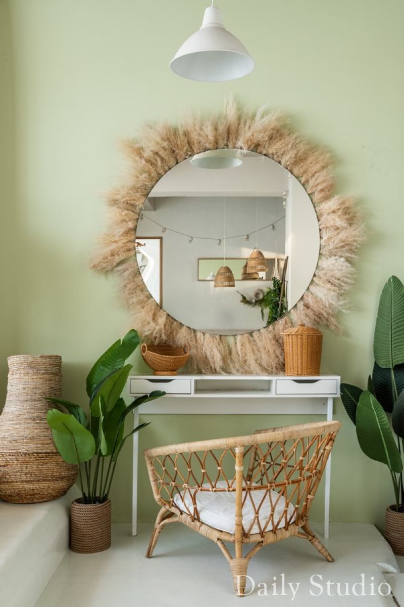 — туалетный столик с круглым зеркалом и плетенным креслом;
