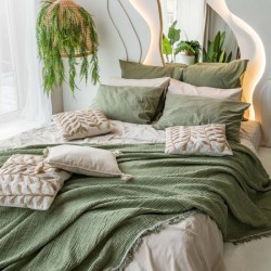 — угловой диван с каменным основанием и подушками льняного оттенка;
