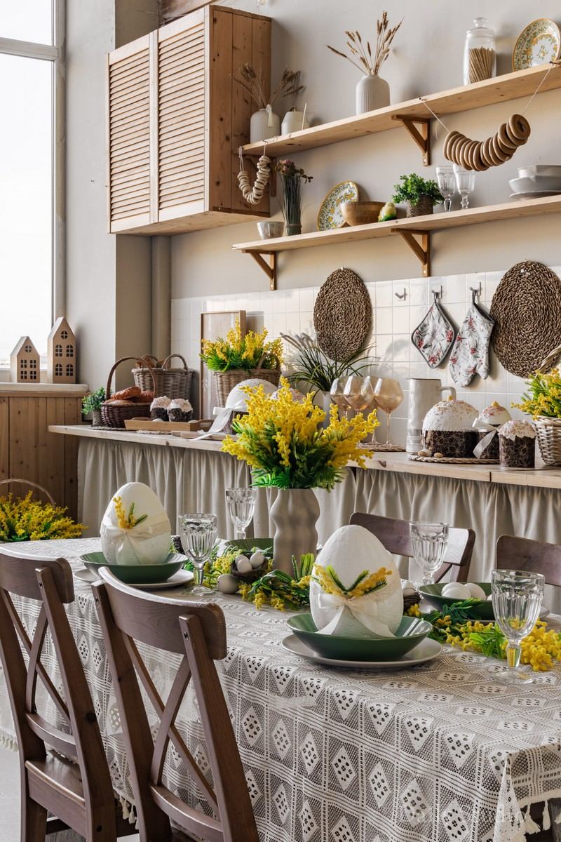 — деревянный обеденный стол с праздничной сервировкой на четыре персоны;