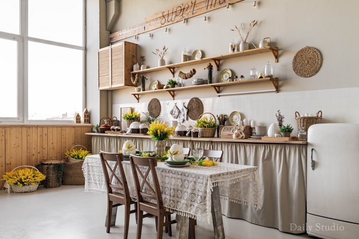 — деревенская кухня с красивыми полочками и ящичками, посудой;