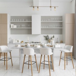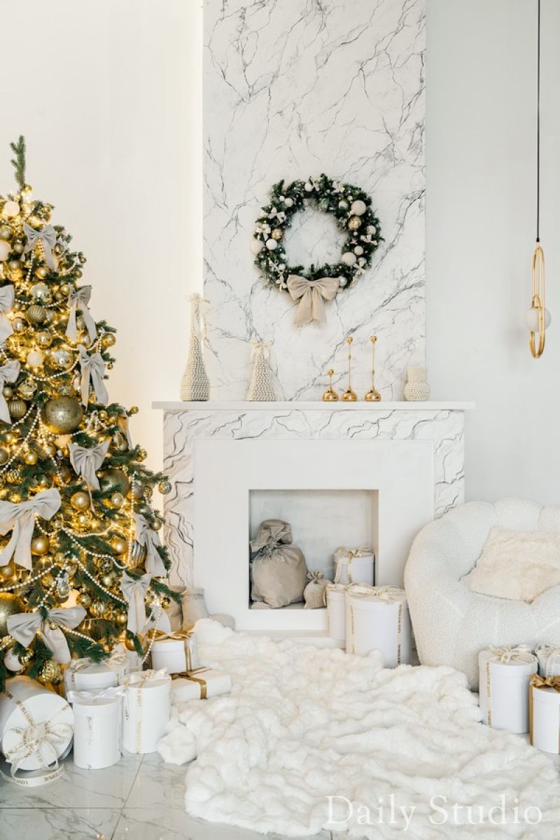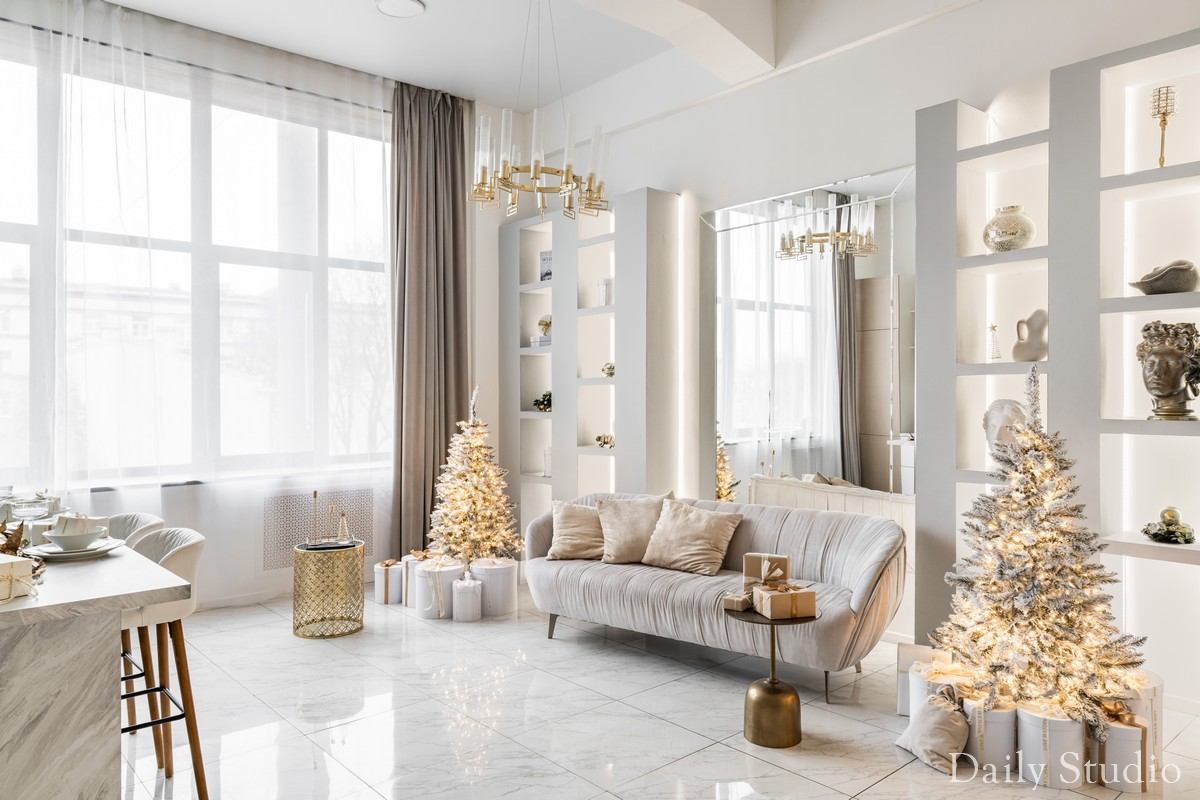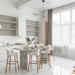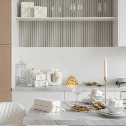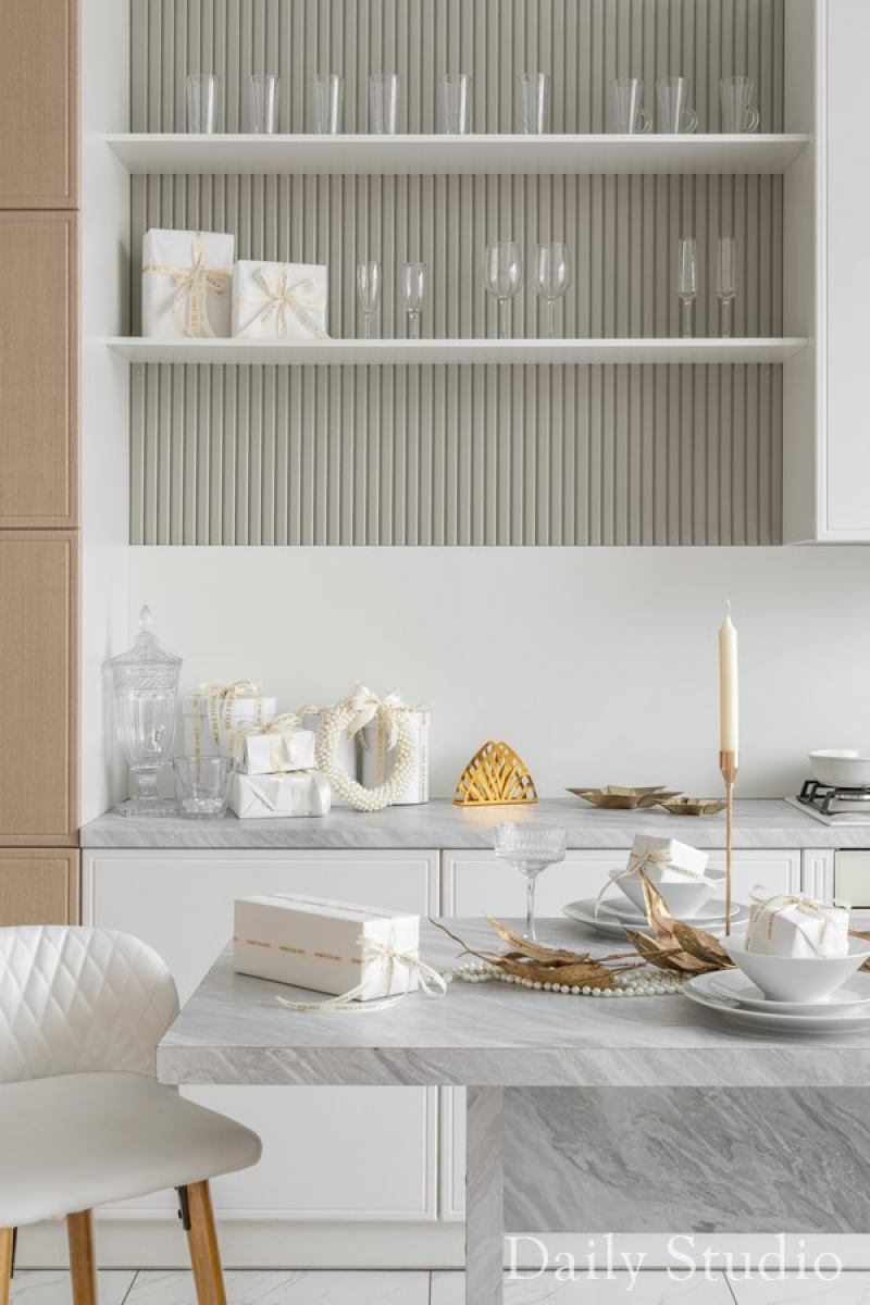 — светлых тонов кухня со столешницей под мрамор и новогодним декором (ВНИМАНИЕ! Кухня нерабочая);
