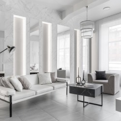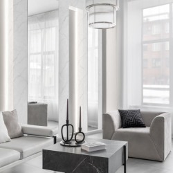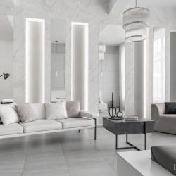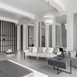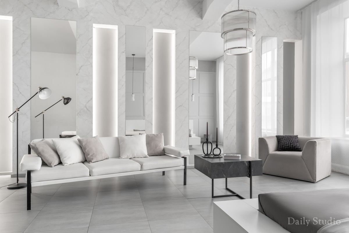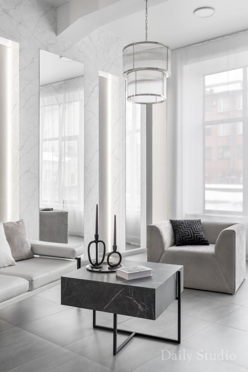 — белый диван с кубическим столом на фоне мраморной стены с зеркальными вставками;