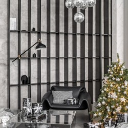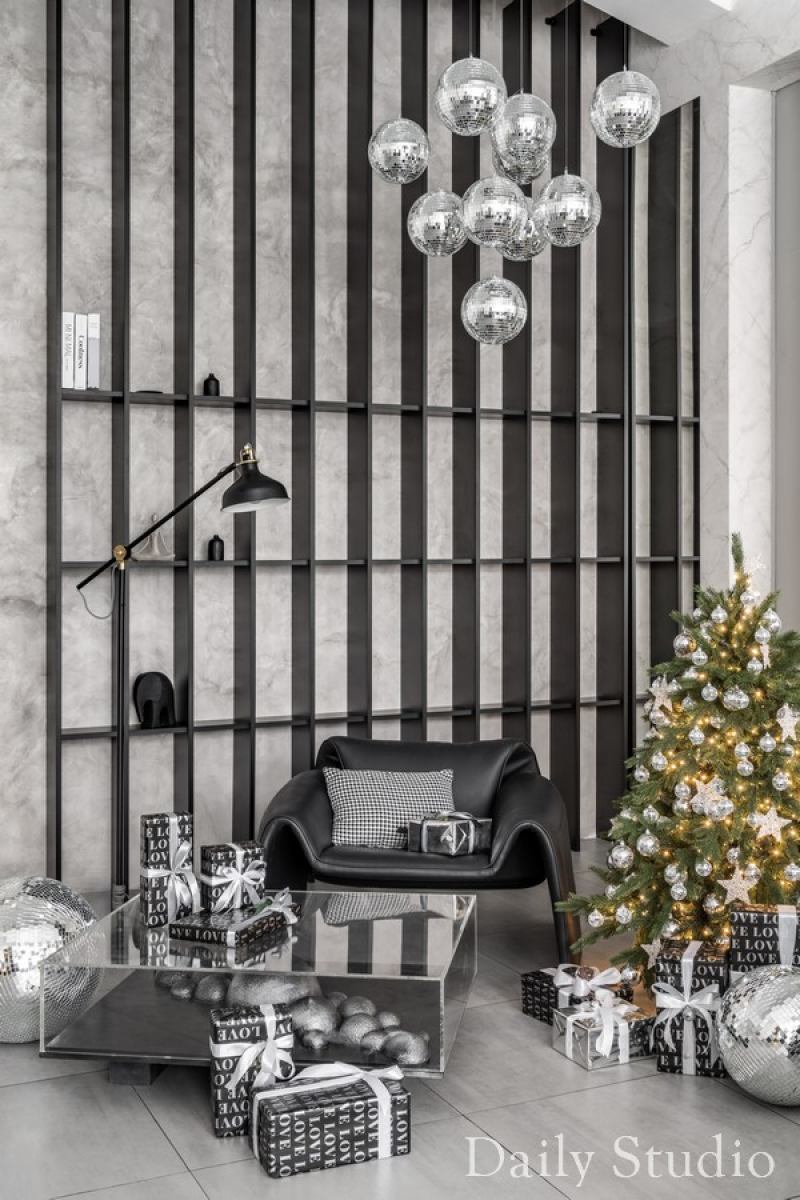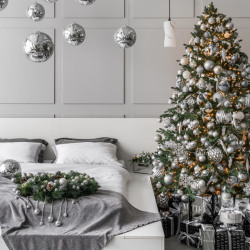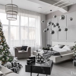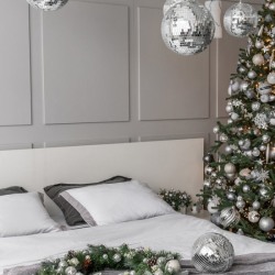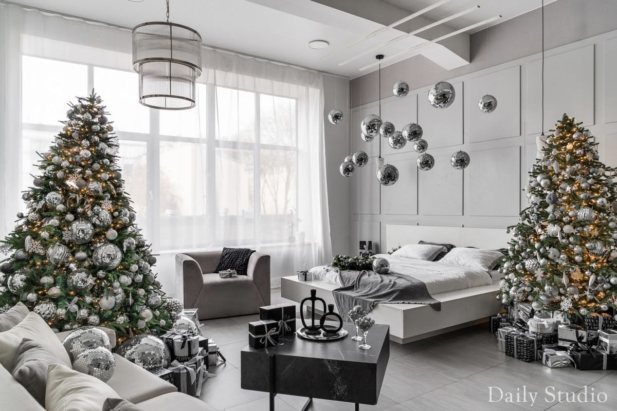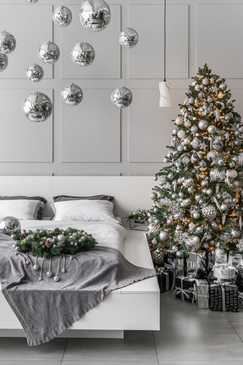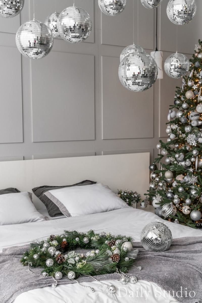 — зона с дизайнерской кроватью на фоне графических панелей серого цвета, подвесными над кроватью диско-шарами и пышной елкой;