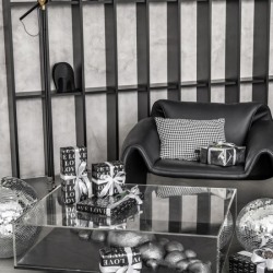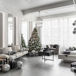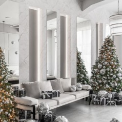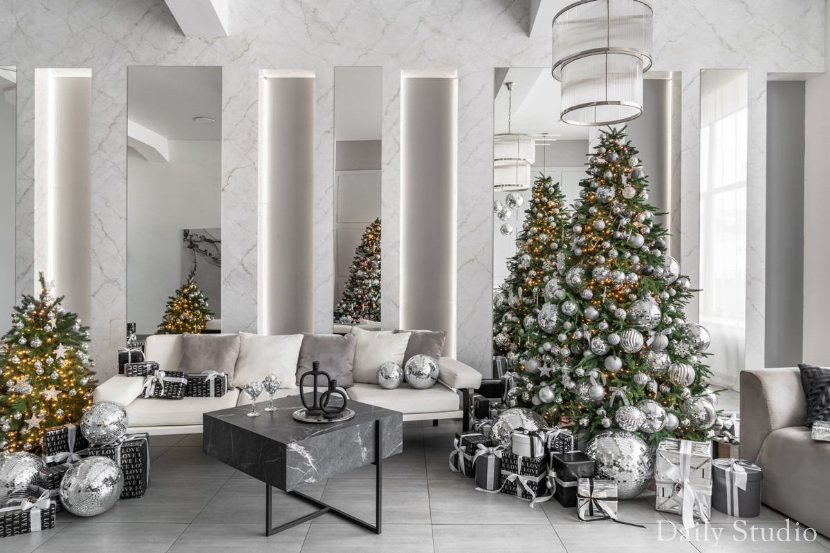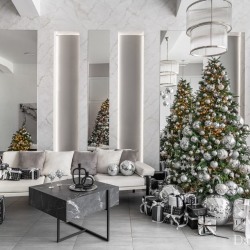 — большая пышная елка с белым диваном и кубическим столом на фоне мраморной стены с зеркальными вставками;