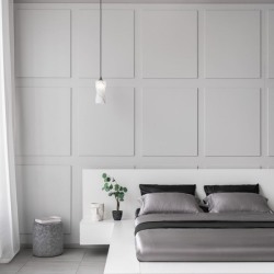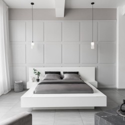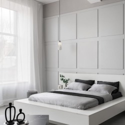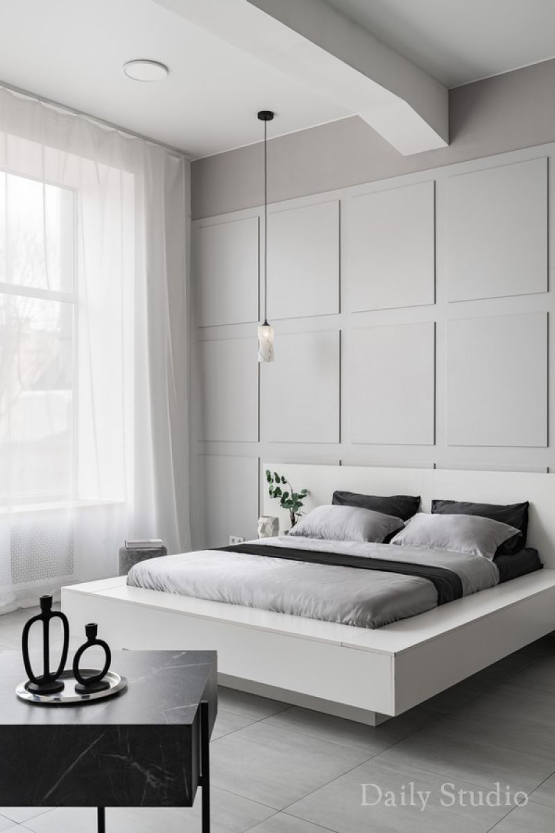 — дизайнерская кровать на фоне графических панелей серого цвета;
