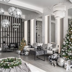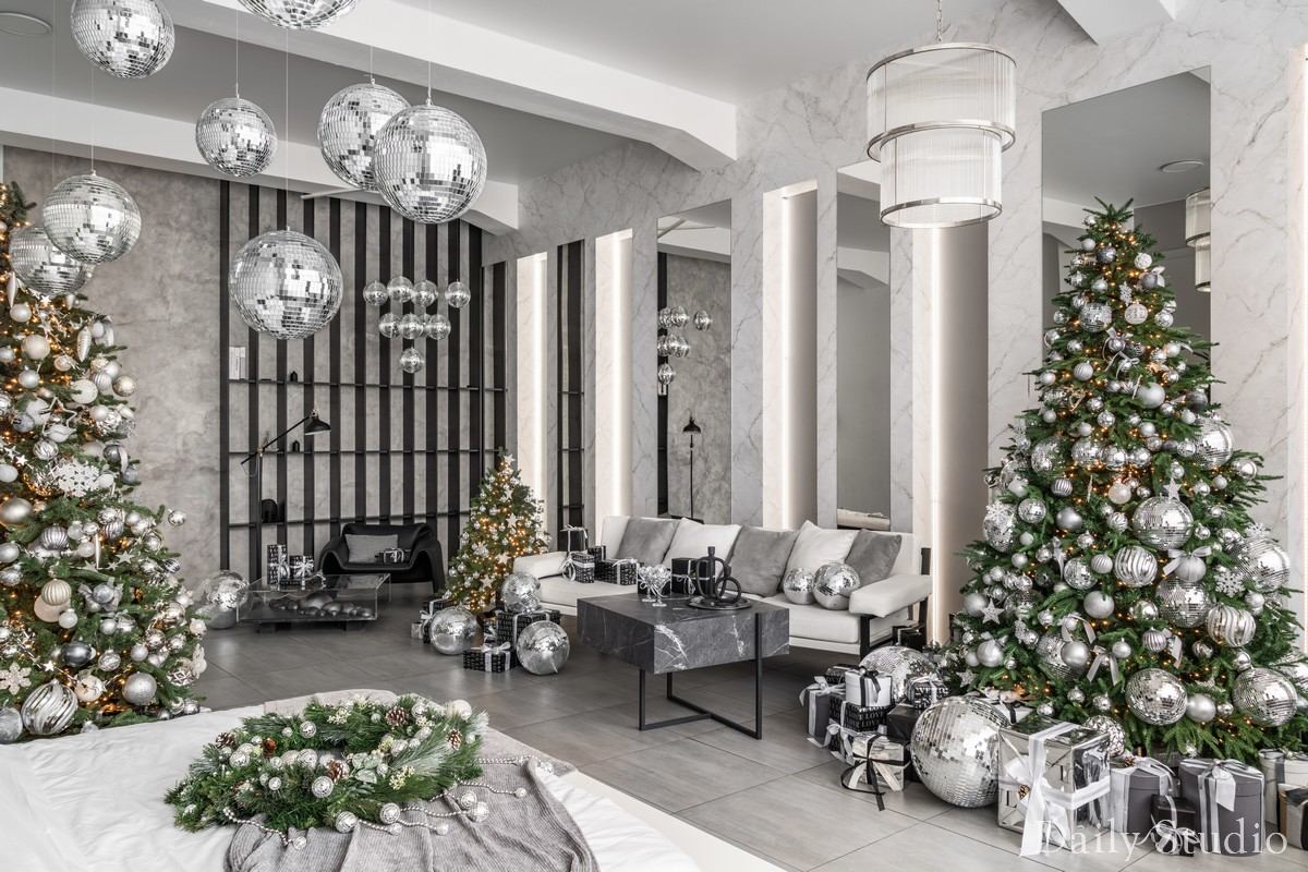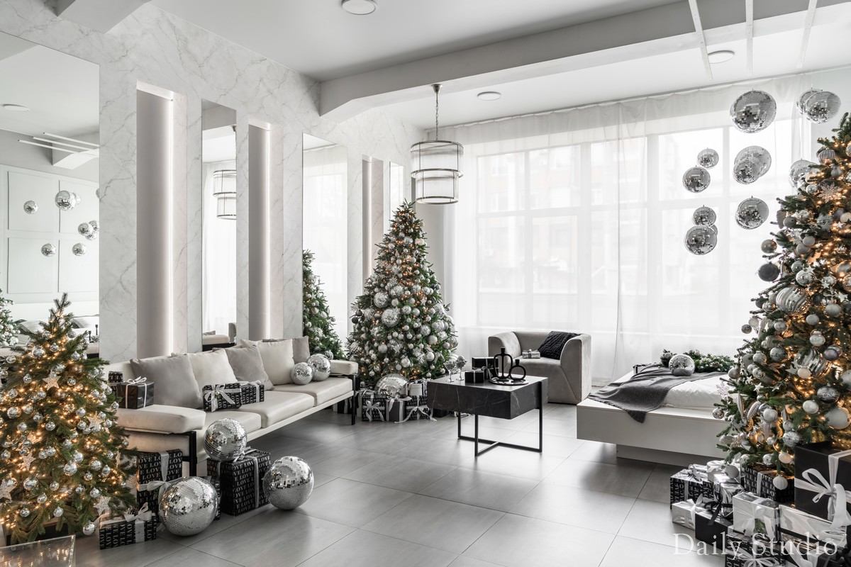 Оформленный в белых, серых и серебристых тонах, просторный и минималистично декорированный зал Balance станет идеальным пространством для стильных новогодних кадров.