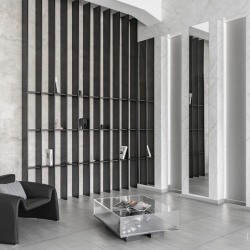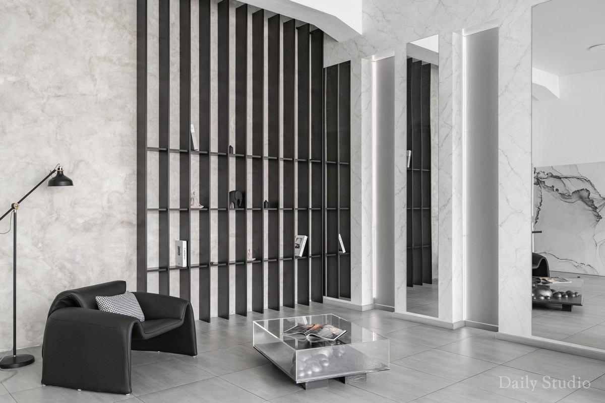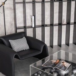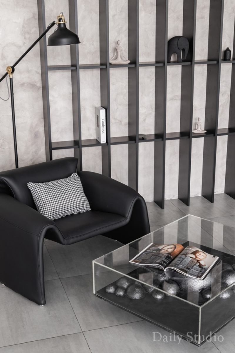 — черное кожаное кресло и стеклянный журнальный столик на фоне фактурной стены с черными полками;
