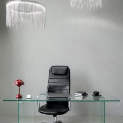 — красное кресло с металлическим журнальным столиком на фоне металлической настенной вставки с подсветкой;