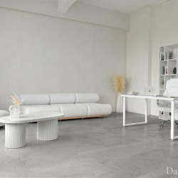 Зал умело поделен на две зоны: бежевую и белую. В бежевой зоне минимум предметов, необычных форм мебель и много воздуха. В белой зоне установлена циклорама.