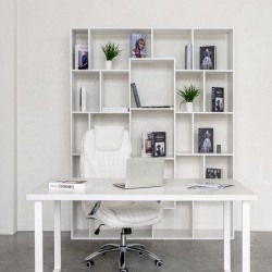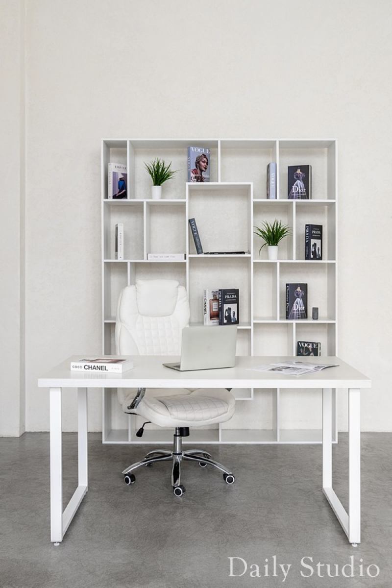 - зона с офисным столом и креслом на фоне стеллажа;