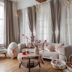 — зона со светлым диваном, журнальным столиком и пышной елкой;