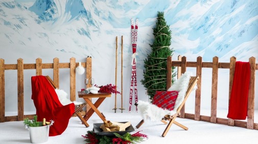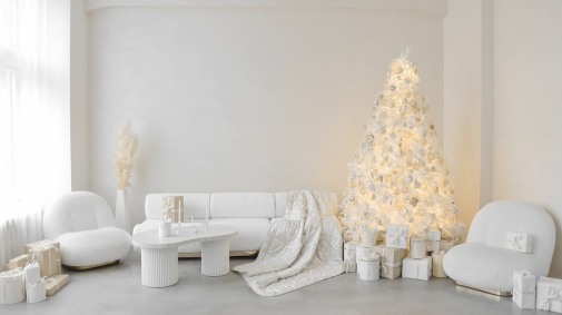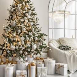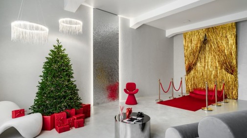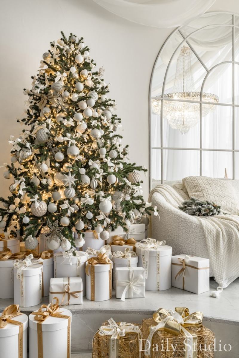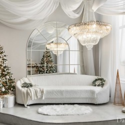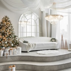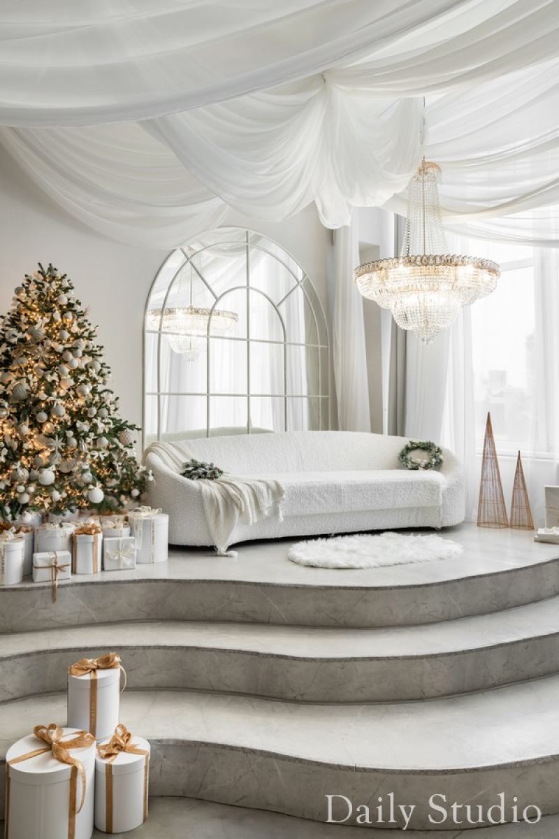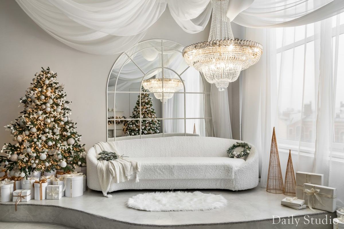 — белый диван с новогодней елью и праздничным декором, установленный на подиуме с зеркальной имитацией окна;