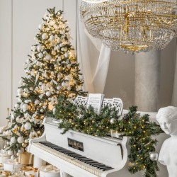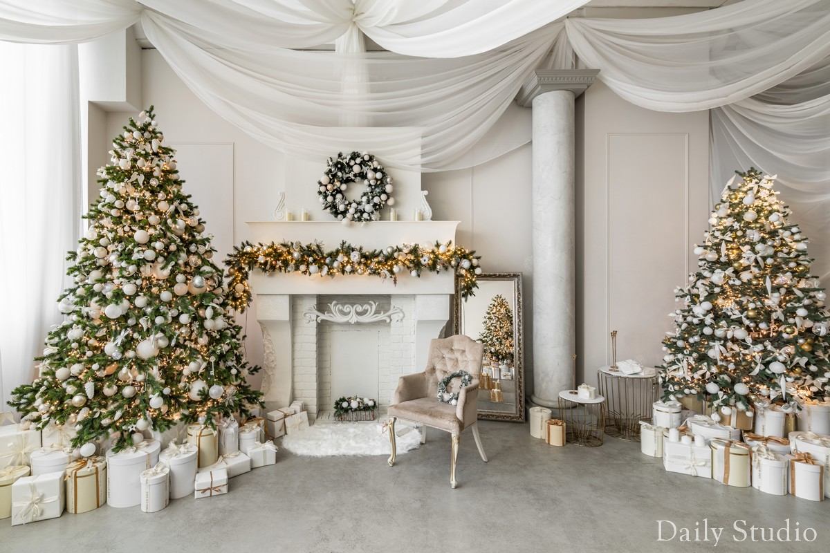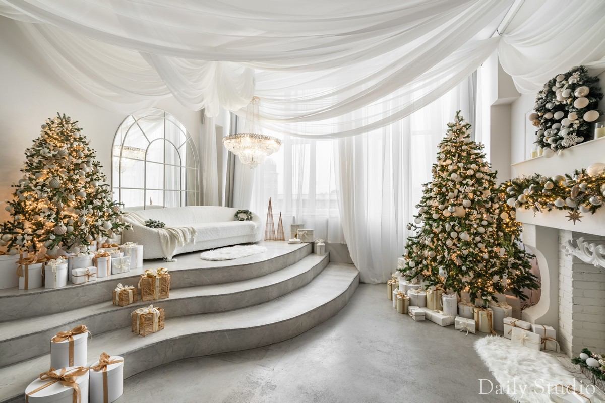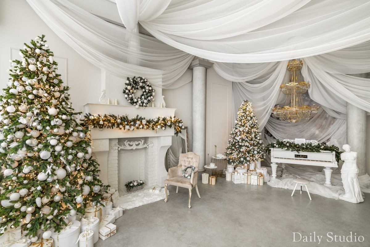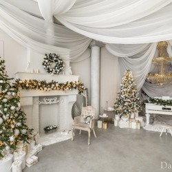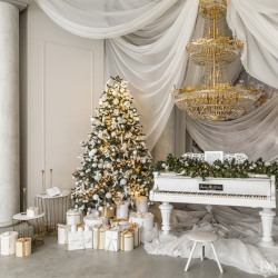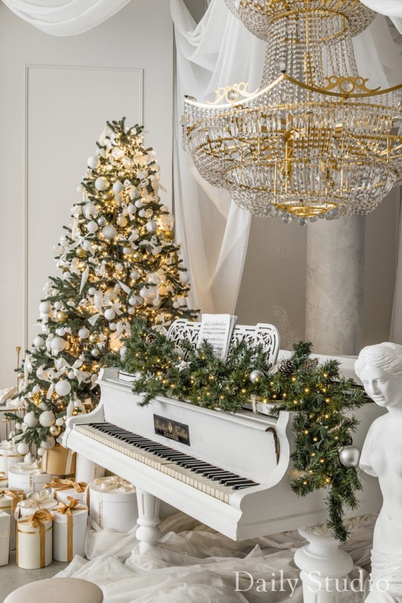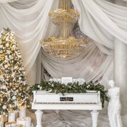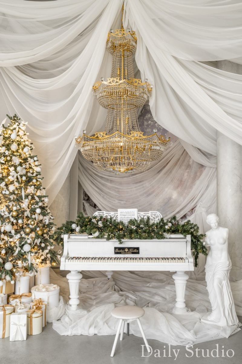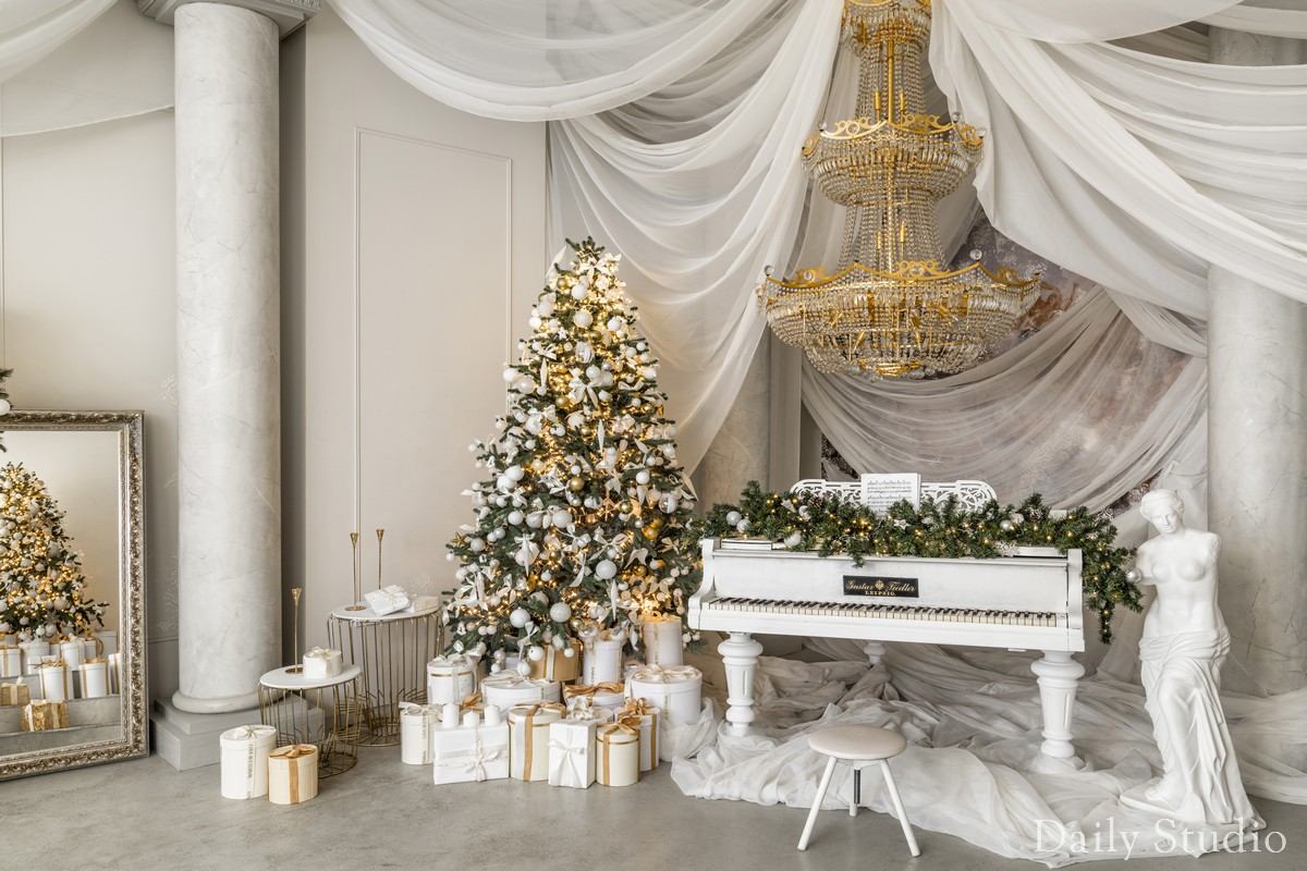 — зона с роялем цвета слоновой кости и пышной елкой под золотой хрустальной люстрой среди мраморных колонн и полотен из вуали на фоне изображения в стиле эпохи возрождения;