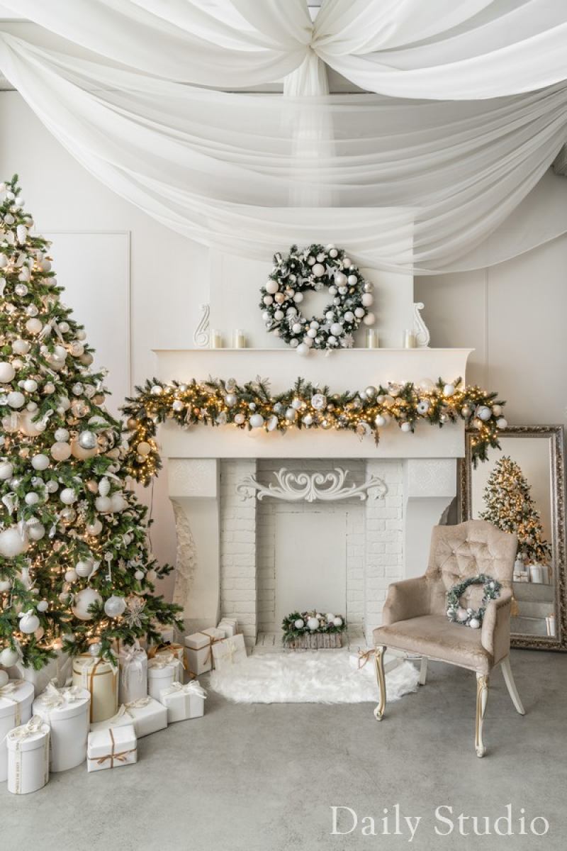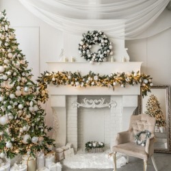 — зона с камином и мраморными колоннами в стиле барокко в новогоднем оформлении.