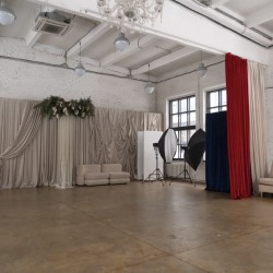 В зале также находятся гримёрный стол, рейлы для одежды, технический передвижной стол для фотографа, флаги.