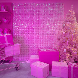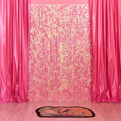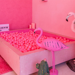 - Передвижной большой розовый бассейн с шариками и меховая стена с ростовым меховым зеркалом;
