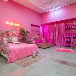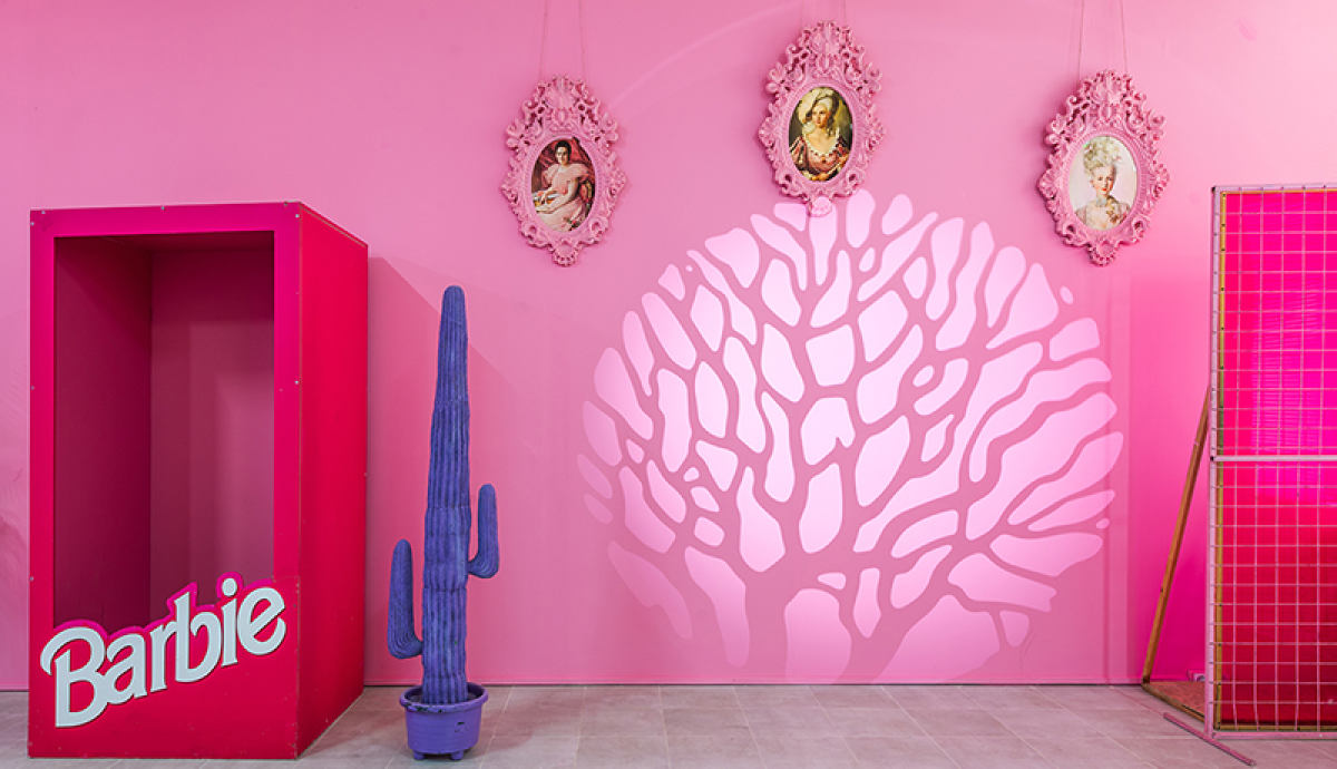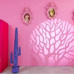 - Розовые стулья, фиолетовый кактус и даже розовый скелет;