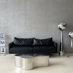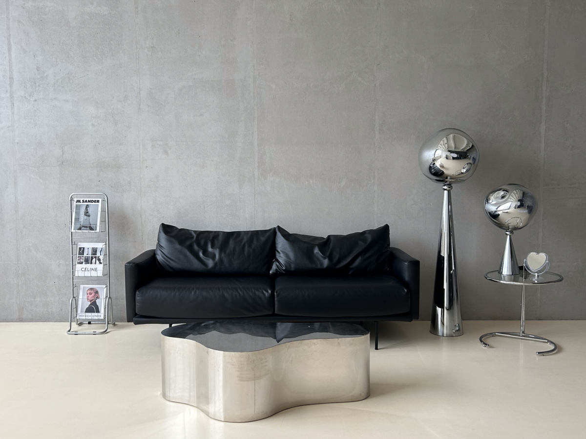 - Черный кожаный диван, два металлических торшера, дизайнерское кресло Wassily chair, черный столик, прозрачный журнальный столик, огромный диско-шар, большое серое кресло, белый стул, серая металлическая тележка и множество аксессуаров,