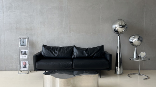 • стильное черное кожаное кресло, розовое кресло, большая пальма, черно-белая картина и большое зеркало, металлическая черная лестница;