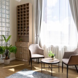 Большой зал с рабочей кухней, гостиной, спальней, кабинетом и прихожей. К залу примыкает собственная гримерная комната. Для больших команд есть комната отдыха, грузовой лифт, возможность хранения техники и реквизита.