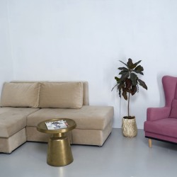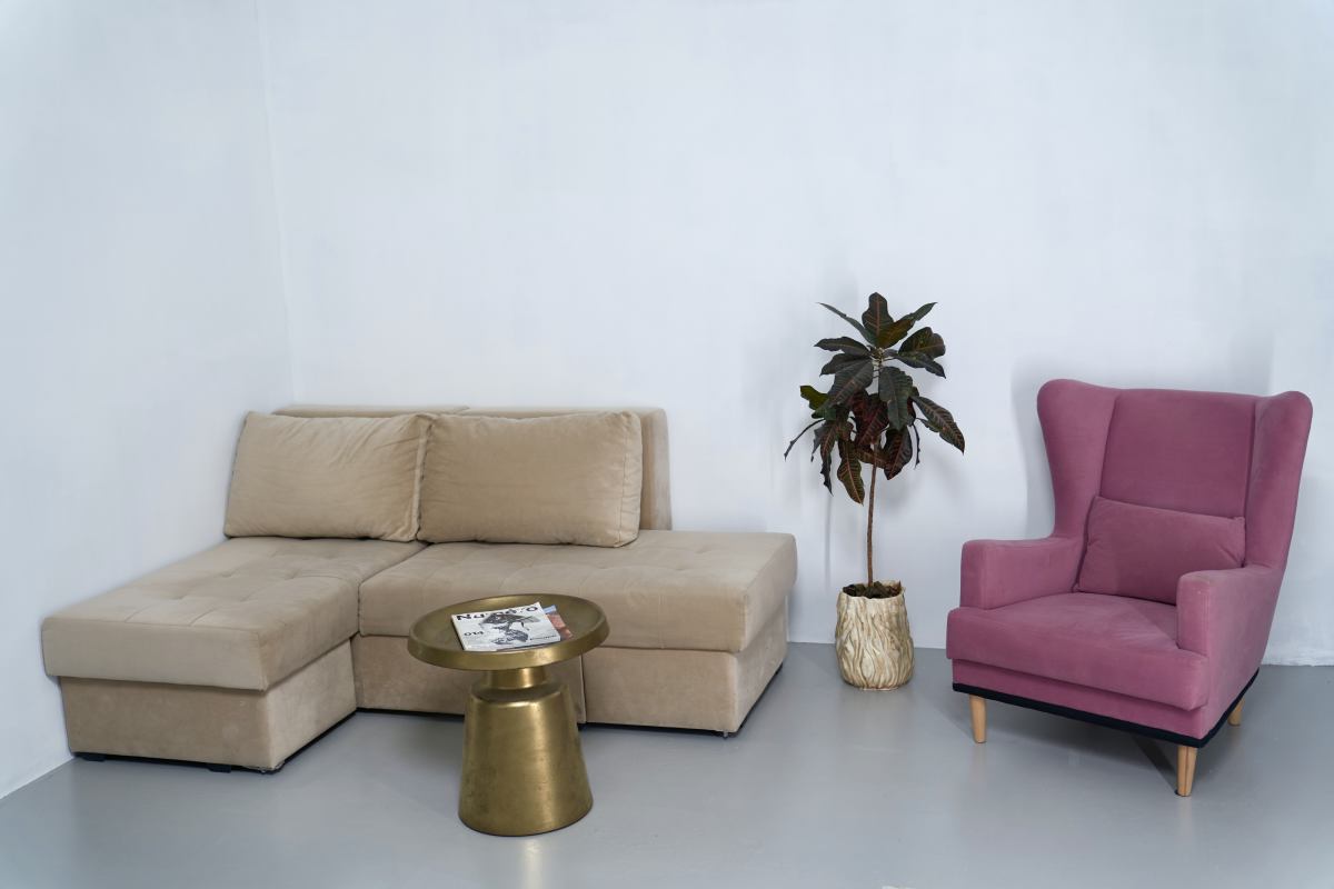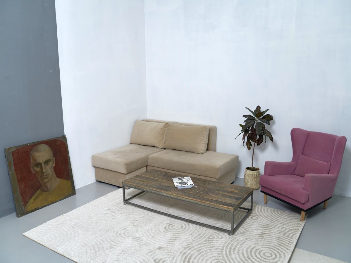 Угловая циклорама 5х5, интерьерная стена с серым полом и мебелью, и угол с большой бетонной лестницей. С возможностью записи чистого звука, большой выбор оборудования, реквизита и мебели, с формированием пространства под нужные задачи.