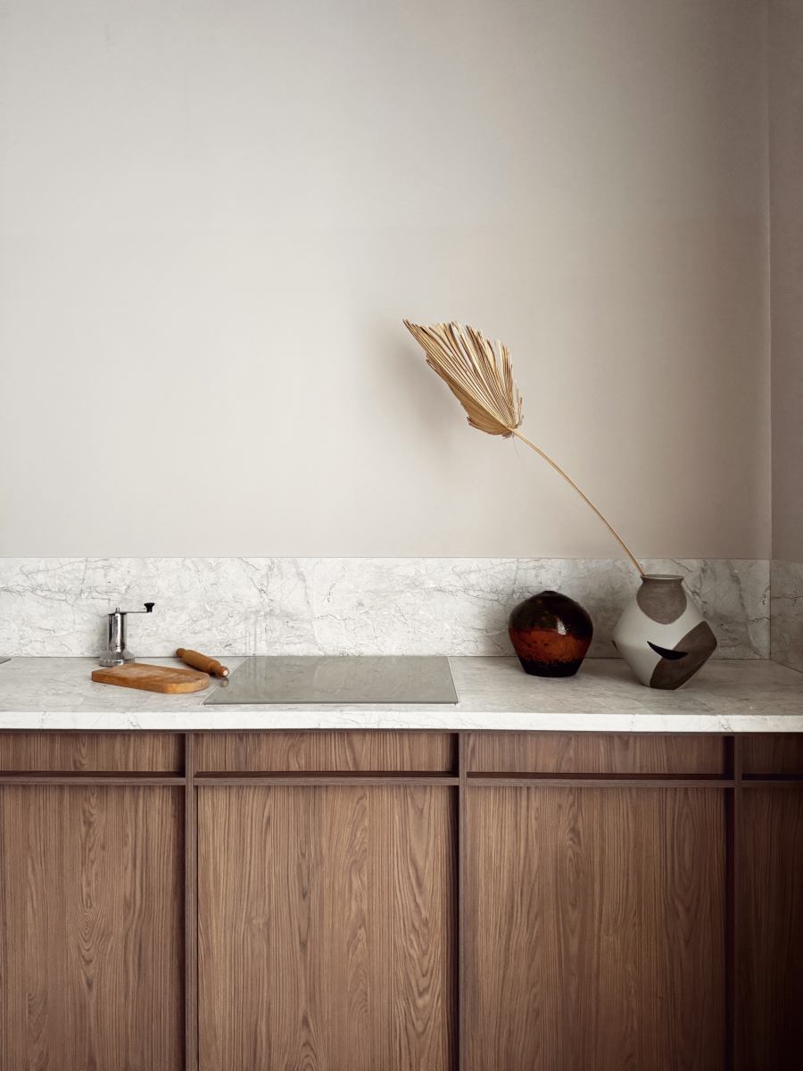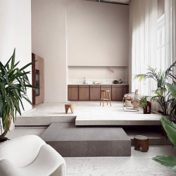 Высокие потолки, мягкий естественный свет сквозь фактурные шторы, натуральное дерево, светлый камень и спокойная бежевая палитра создают ощущение воздуха, тишины и архитектурной чистоты. Минимализм, натуральные текстуры и продуманная геометрия делают зал универсальным: он одинаково красиво работает как в чистых предметных съёмках, так и в живых эмоциональных сценах.