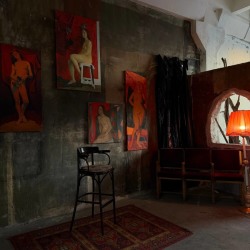 Зал с большой угловой циклорамой, красным латексным фоном, бумажными фонами в рулонах и передвижным двусторонним фоном в персиковом и зелёном цвете. Также