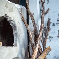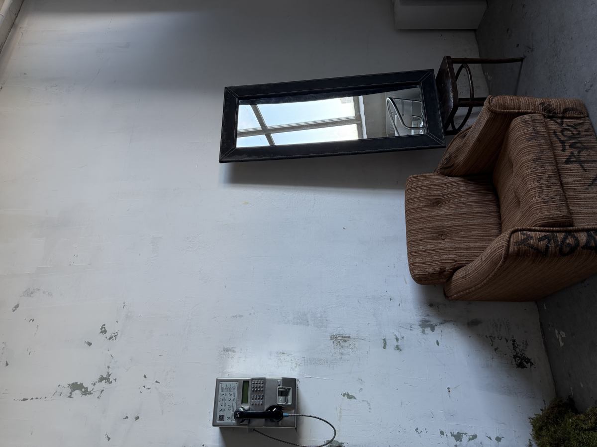 Минималистичный зал с кроватью, стульями, зеркалом и кожаным диваном. В зале установлена плетёная ширма, на окне шифоновая штора в пол. Текстурная стена