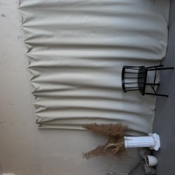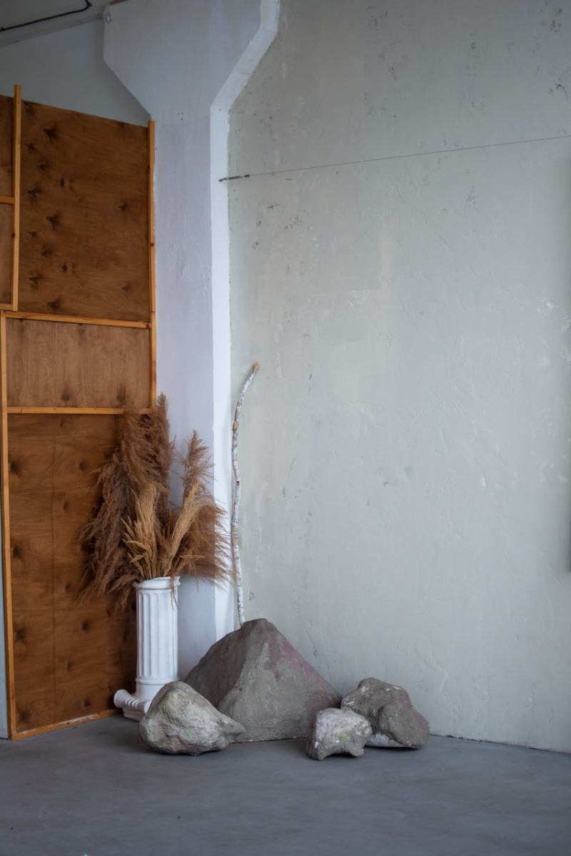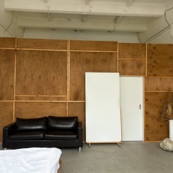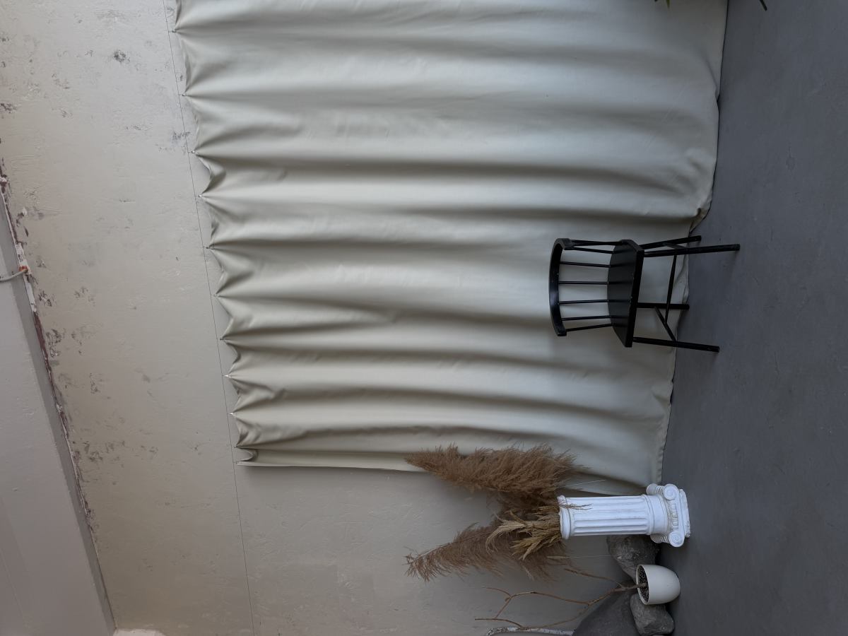 Зал с большой угловой циклорамой, красным латексным фоном, бумажными фонами в рулонах и передвижным двусторонним фоном в персиковом и зелёном цвете. Также