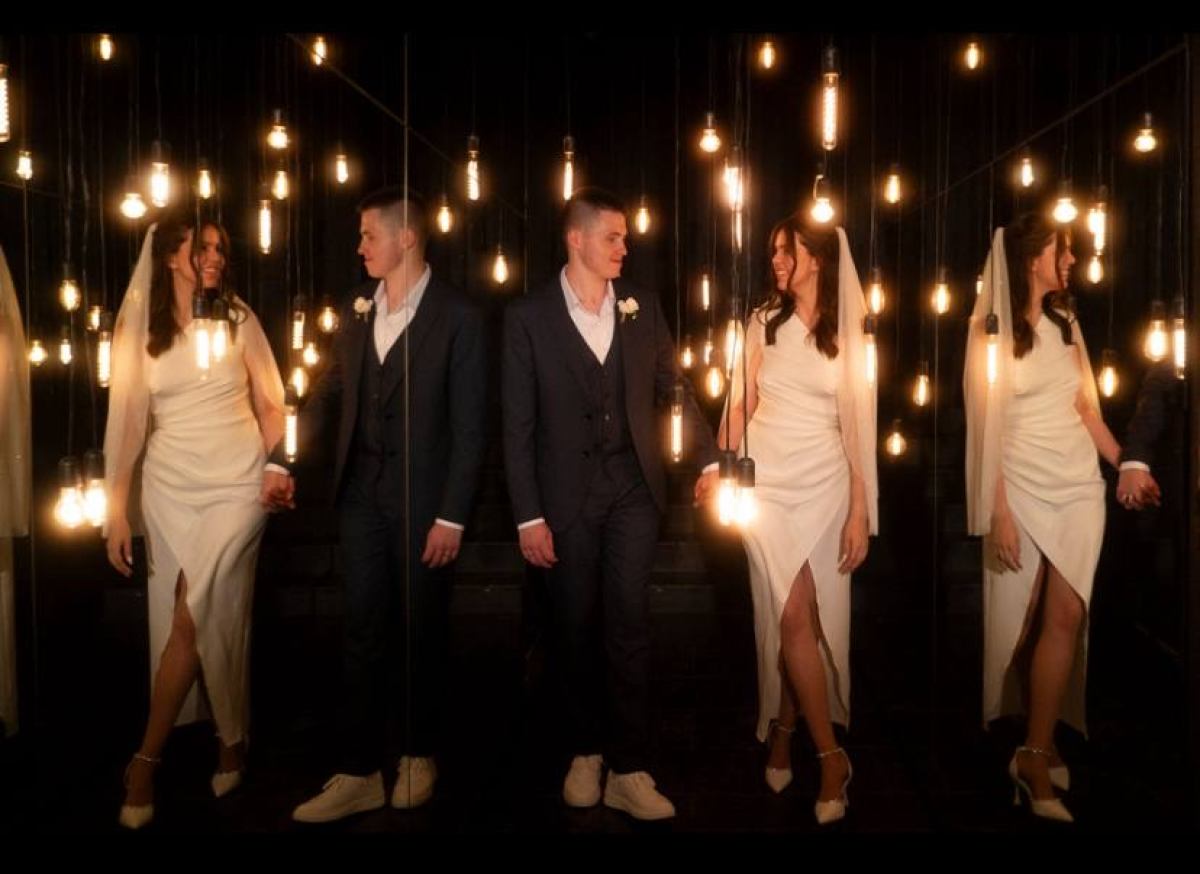 Большой интерьерный зал.В зале белая циклорама 4*4, зеркальный коридор с лампочками, большая деревянная дверь,интерьерные стены и большая деревянная дверь