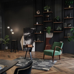 Грубость отделки в сочетании с деталями, создающими тепло, а мебель, сочетающая в себе современность и комфорт. Особое внимание отведено декору – светильникам, люстрам, подсветке, элементам искусства – картины и скульптуры в стилистике авангарда, озеленение, придающее легкости пространству, общий антураж зала – строгий и минималистичный – становится прекрасным местом для съемки портретов.