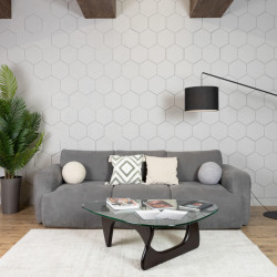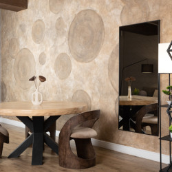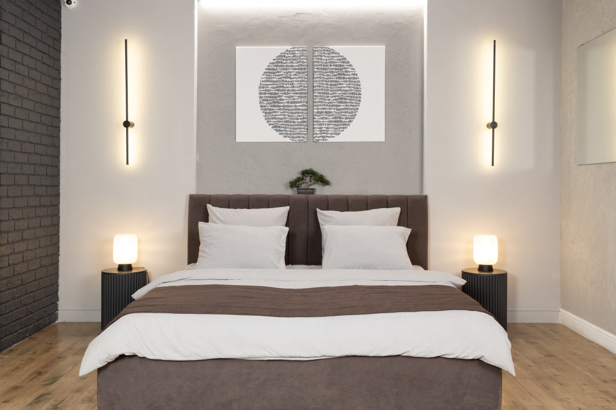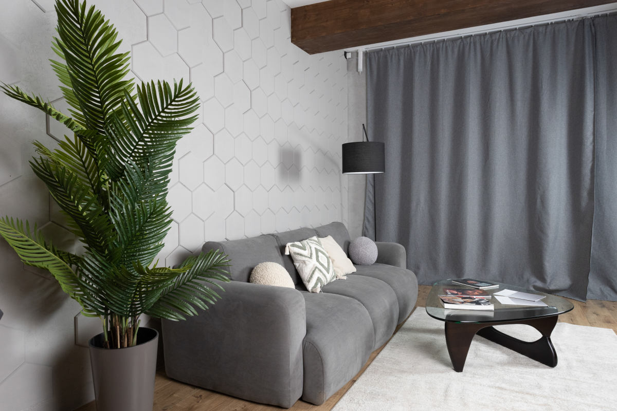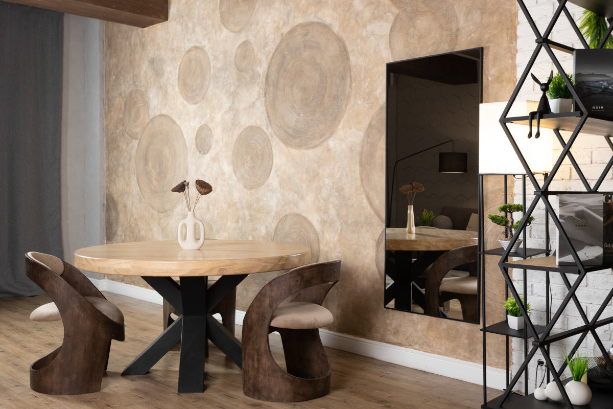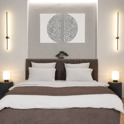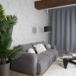 Зона гостиной выполнена в теплых оттенках, здесь располагается большой диван, 2 кресла, небольшой журнальный столик, кровать с тумбочками, обеденный стол и стулья. В зоне гостиной находятся панели с внутренней подсветкой.