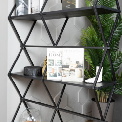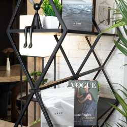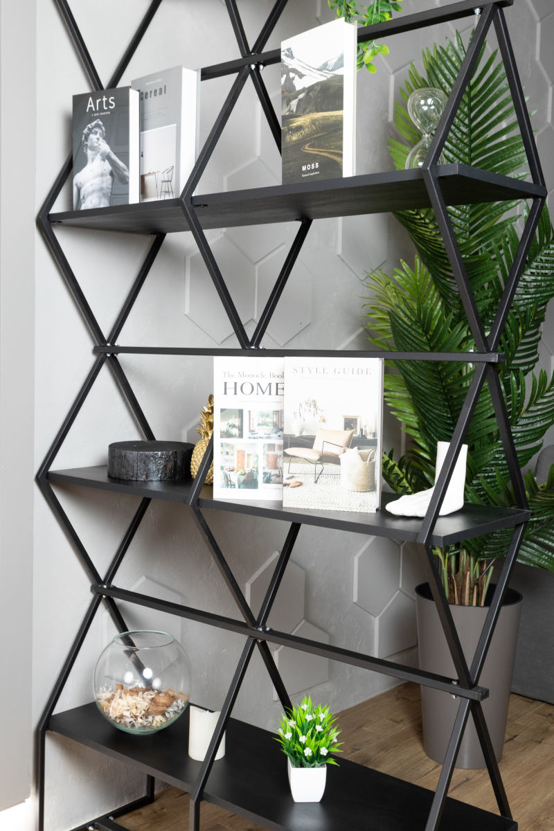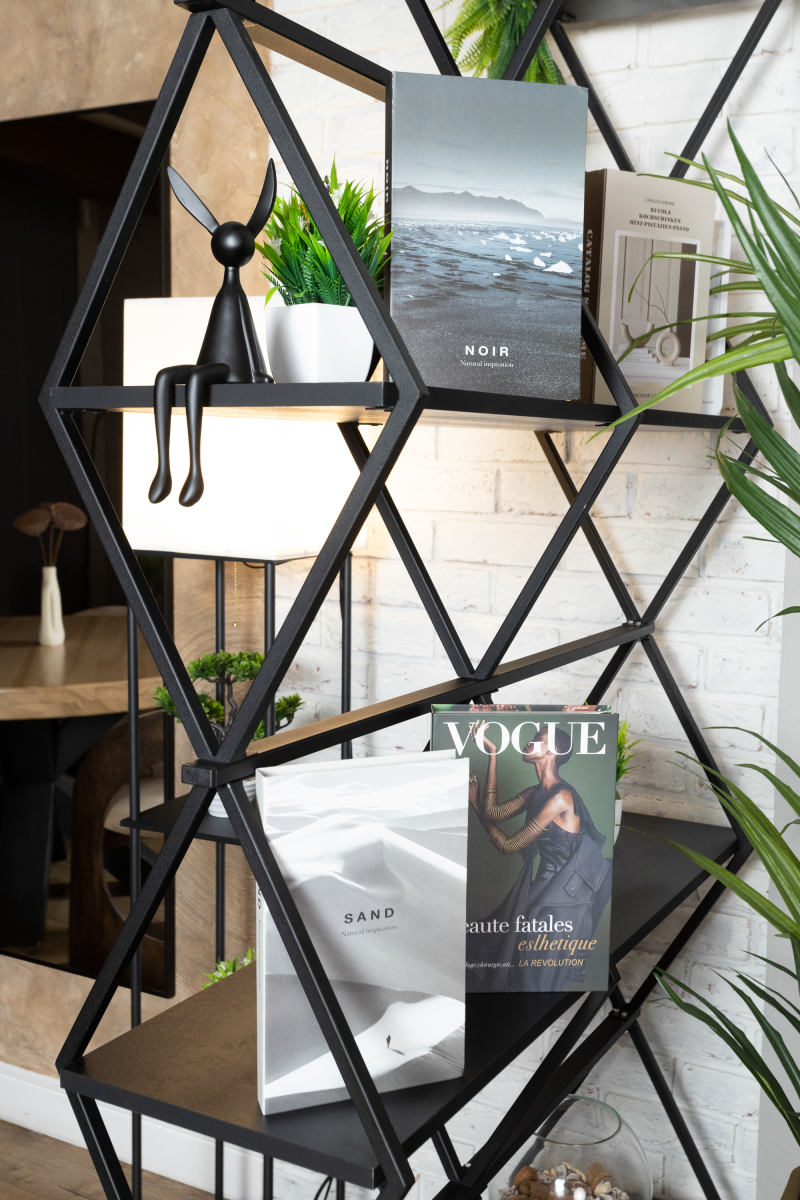 Светлый зал с тремя зонами и большим окном. Разделяют зоны стеллажи, с множеством декора и книг.