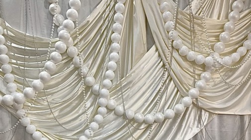 много мебели, цветов, красивых веток, пампасной травы, стульев, есть большая золотая рама,