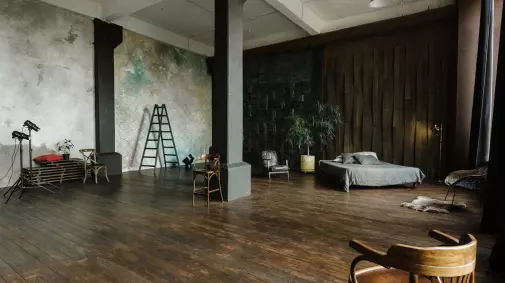 Белая угловая циклорама 6*3 м, черная матовая стена, бумажные фоны,стена из красного кирпича.