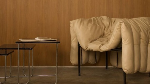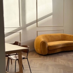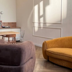 - Дизайнерский диван горчичного цвета, деревянный стол, различные кресла и стулья