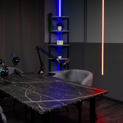 Стильный стол с мраморной текстурой, мягкие кресла, аккуратный декор и световые линии — всё работает на статус и визуальную чистоту.