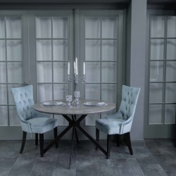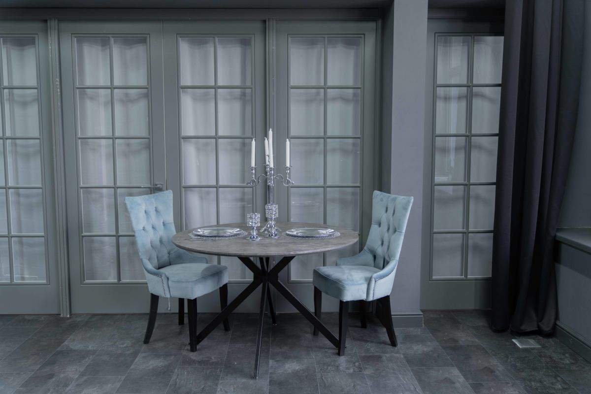 — большой круглый обеденный стол с сервировкой, голубые стулья, декор;