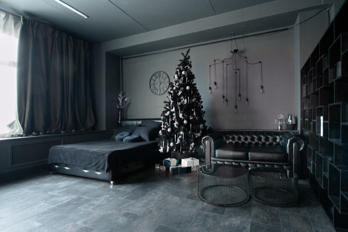 —черная кровать (на колесиках), черное постельное белье;