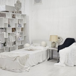 большой белый стеллаж с декором, журнальные столики, серое кресло;